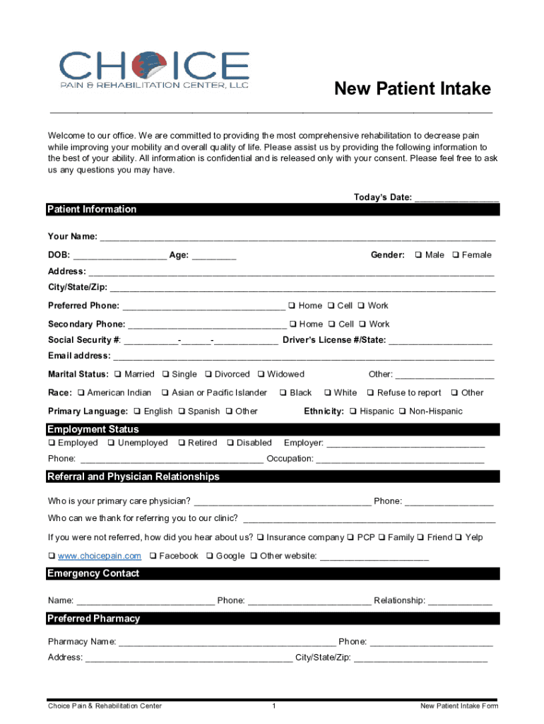 New Patient Intake Welcome to our office. We are committed to providing the most comprehensive rehabilitation to decrease pain while improving your mobility and overall quality of life. Please assist