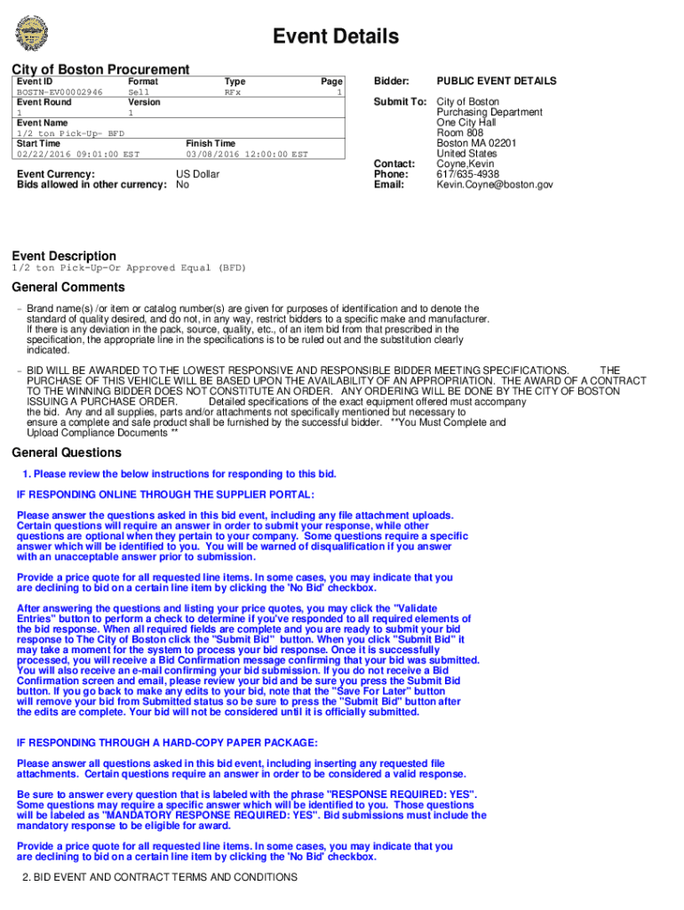Event Details City of Boston Procurement Event ID Format BOSTNEV00002946 Sell Event Round Version 1 1 Event Name 1/2 ton Pickup BFD Start Time 02/22/2016 09:01:00 Ecotype Rampage 1Bidder:PUBLIC EVENT
