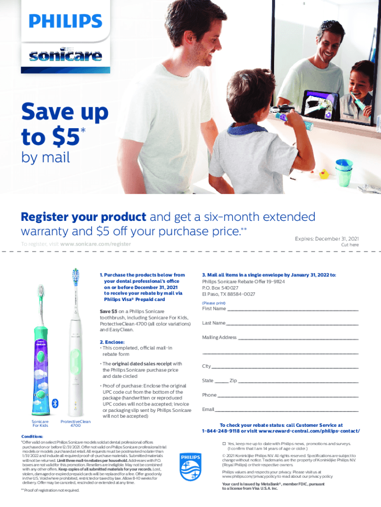 Save up to $5* by mailRegister your product and get a six-month extended warranty and $5 off your purchase price.** Expires: December 31, 2021, To register, visit www.sonicare.com/register1. Purchase