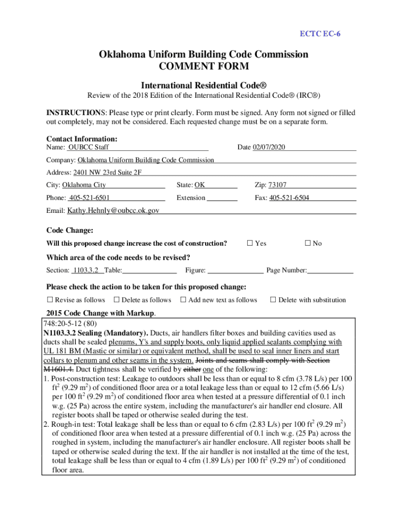 ETC EC6Oklahoma Uniform Building Code Commission COMMENT FORM International Residential Code Review of the 2018 Edition of the International Residential Code (IRC) INSTRUCTIONS: Please type or print