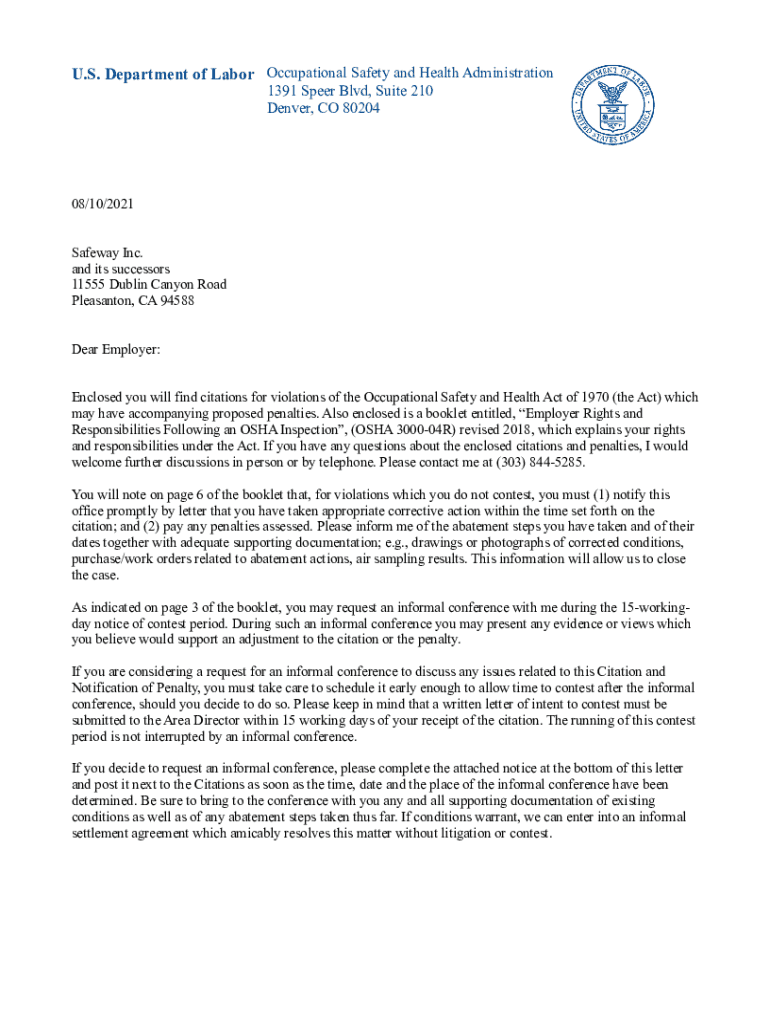 U.S. Department of Labor Occupational Safety and Health Administration 1391 Speer Blvd, Suite 210 Denver, CO 8020408/10/2021 Safeway Inc. and its successors 11555 Dublin Canyon Road Pleasant on, CA