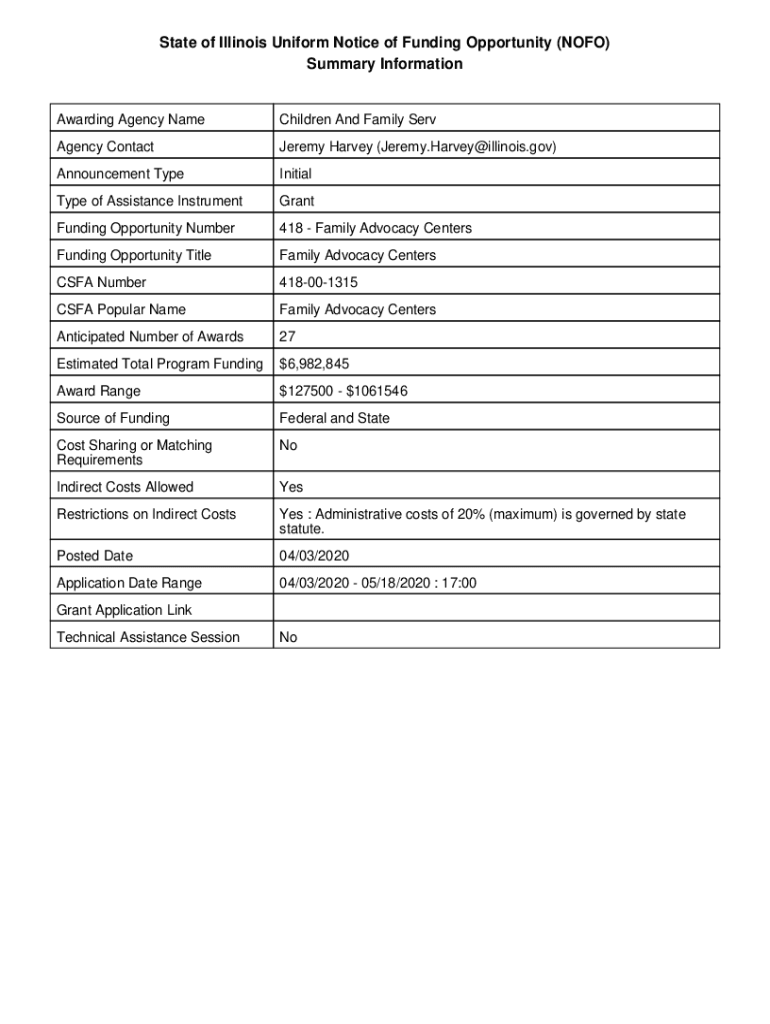 State of Illinois Uniform Notice of Funding Opportunity (NO FO) Summary InformationAwarding Agency NameChildren And Family Stringency Contact Jeremy Harvey (Jeremy.Harvey@illinois.gov)Announcement
