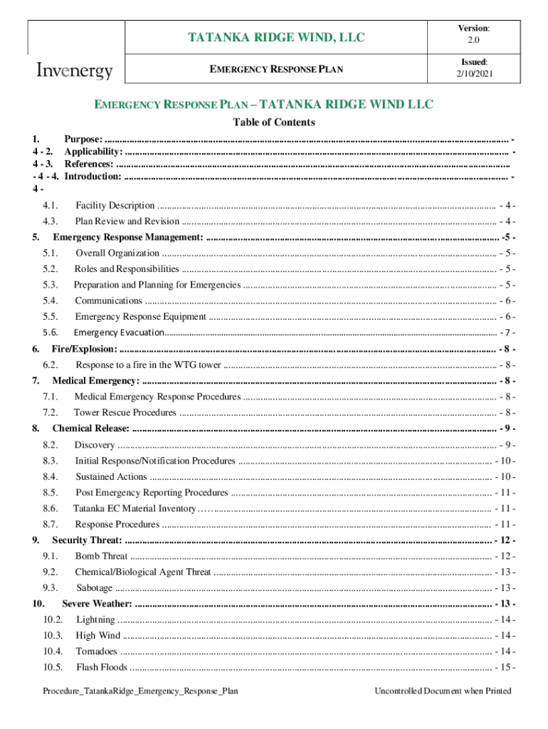 Invent.ergyTATANKA RIDGE WIND, Version: 2.0EMERGENCY RESPONSE PLANIssued: 2/10/2021EMERGENCY RESPONSE PLAN JATAKA RIDGE WIND LLC Table of Contents 1. 4 2. 4 3. 4 4. 4Purpose: ....................................................................................................................................................................