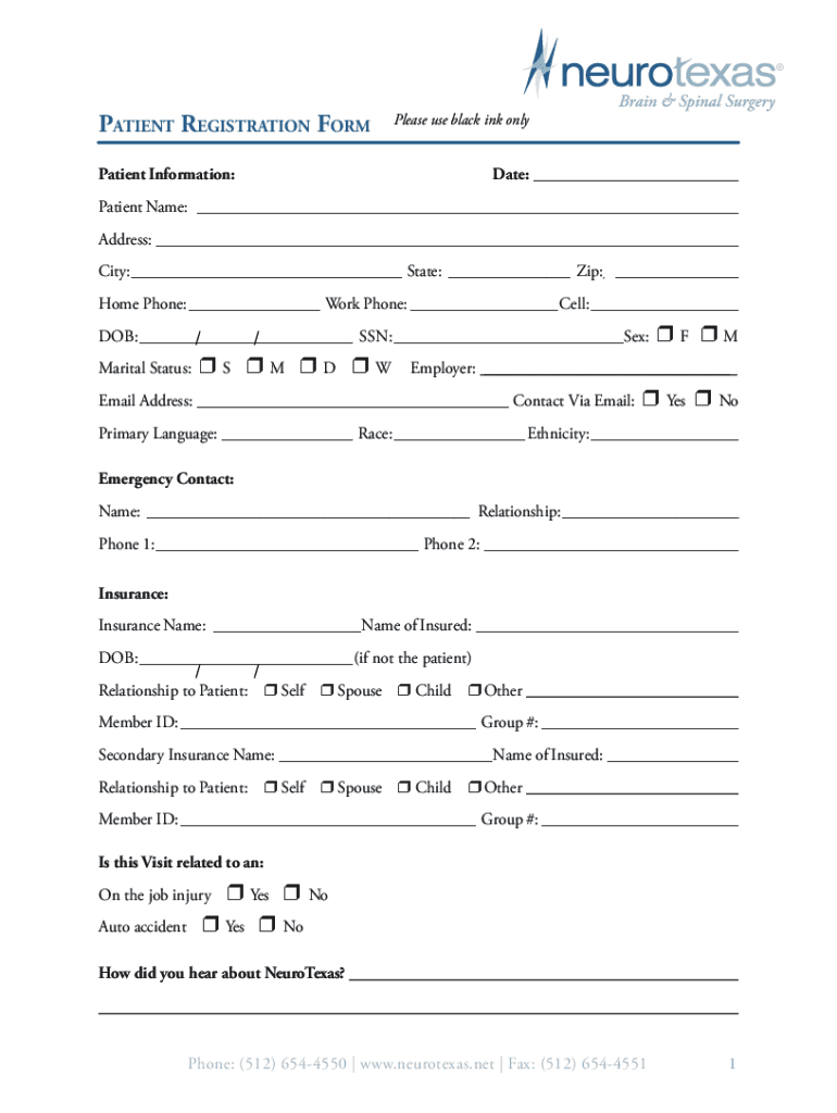 Patient Registration Formulas use black ink outpatient Information:Date: Patient Name: Address: City: State: Zip: Home Phone: Work Phone: Cell: DOB: SSN: Sex: / / Marital Status: S M DW Employer:F