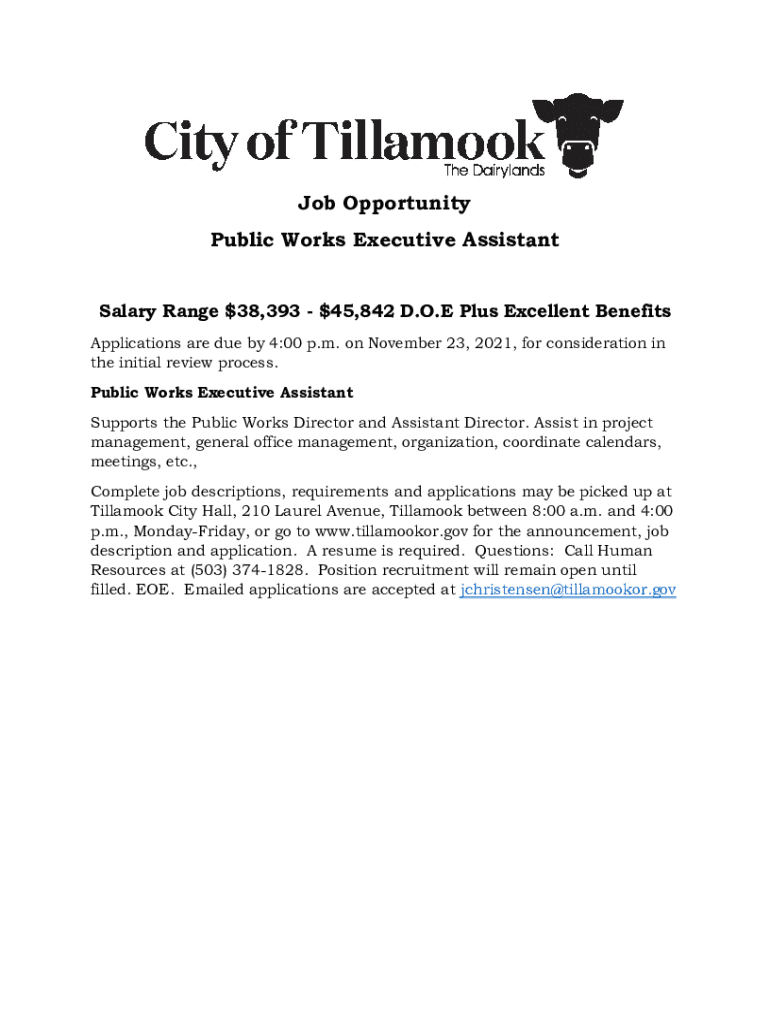 Job Opportunity Public Works Executive Assistant Salary Range $$38,39345,842 D.O.E Plus Excellent Benefits Applications are due by 4:00 p.m. on November 23, 2021, for consideration in the initial