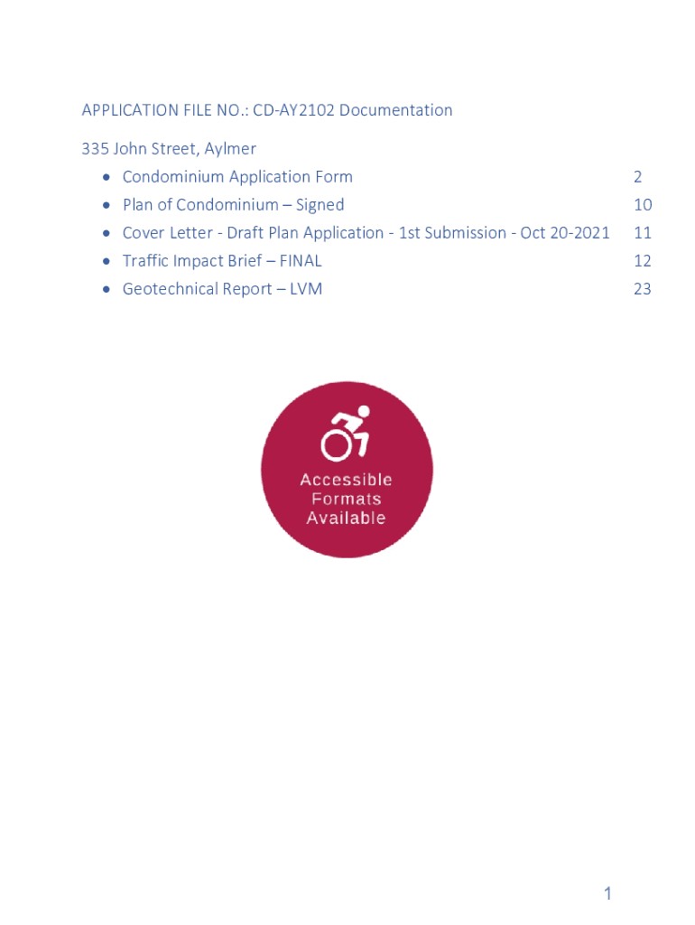 APPLICATION FILE NO.: CDAY2102 Documentation 335 John Street, Aylmer Condominium Application Form2 Plan of Condominium Signed Cover Letter Draft Plan Application 1st Submission Oct 20202110 11 Traffic