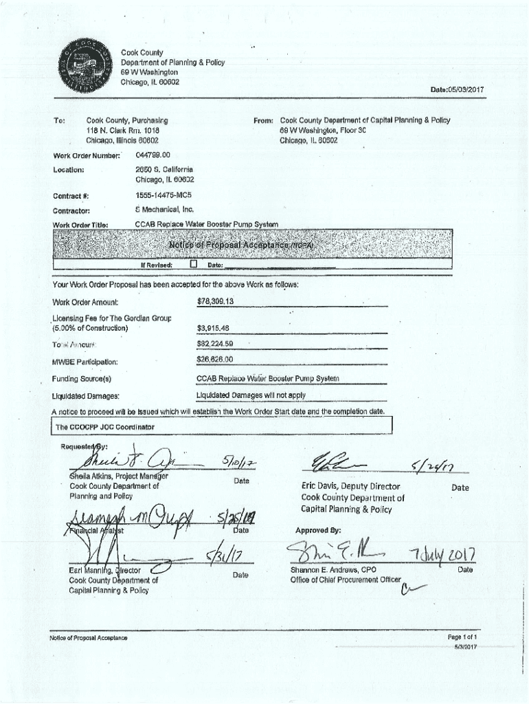 Cook County Department of Planning & Policy 89 W Washington Chicago, IL 60802Date:05/03/2017To:From:Cook County, Purchasing 118 N. Clark Rm. 1018 Chicago, Illinois 60602Cook County Department of Capital