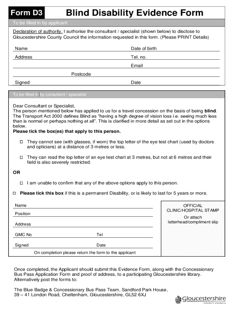 Form D3Blind Disability Evidence Form be filled in by applicant Declaration of authority. I authorize the consultant / specialist (shown below) to disclose to Gloucestershire County Council the information