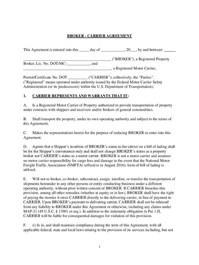 BROKER CARRIER Agreements Agreement is entered into this day of, 20, by and between (BROKER “), a Registered Property Broker, LIC. No. DOT/MC, and, a Registered Motor Carrier, Permit/Certificate