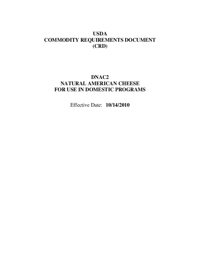 USDA COMMODITY REQUIREMENTS DOCUMENT (CRD)DNAC2 NATURAL AMERICAN CHEESE FOR USE IN DOMESTIC PROGRAMS Effective Date: 10/14/2010USDA COMMODITY REQUIREMENTS DOCUMENT DNAC2 NATURAL AMERICAN CHEESE FOR