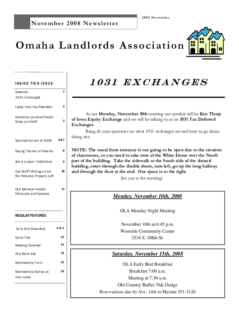 N one m b e r 2 0 0 8 N e w s l e t t e r2 0 0 8 N o v em b her Omaha Landlords Association 1031 ExchangesINSIDE THIS ISSUE: Speaker: 1031 Exchanges1Letter from the President2Operation Landlord Radio