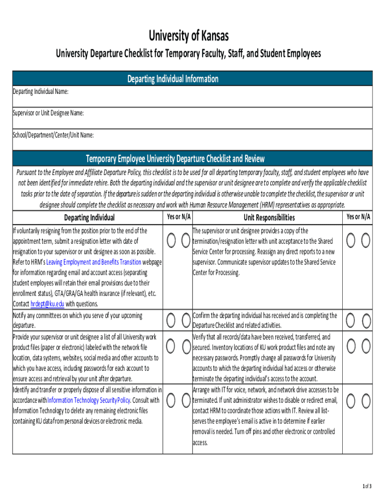 University of Kansas University Departure Checklist for Temporary Faculty, Staff, and Student Employees Departing Individual Information Departing Individual Name: Supervisor or Unit Designee Name: