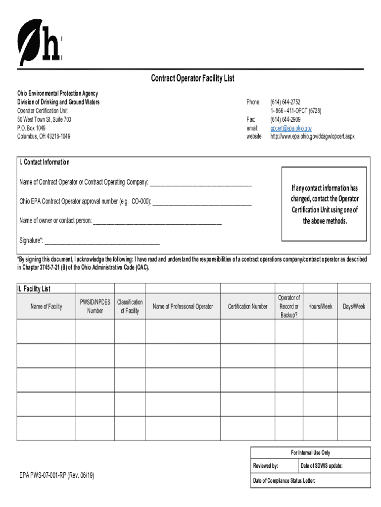 Contract Operator Facility List Ohio Environmental Protection Agency Division of Drinking and Ground Waters Operator Certification Unit 50 West Town St, Suite 700 P.O. Box 1049 Columbus, OH 432161049Phone: