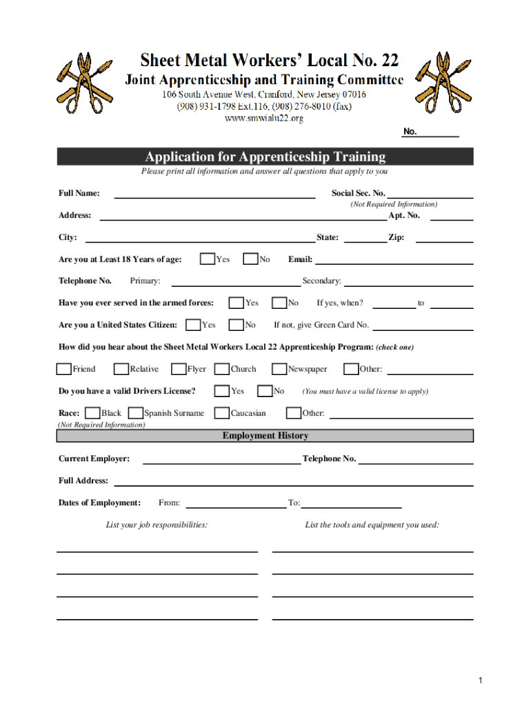 No. Application for Apprenticeship Training Please print all information and answer all questions that apply to your Full Name:Social Sec. No. (Not Required Information)Address:Apt. No. City:State:Are