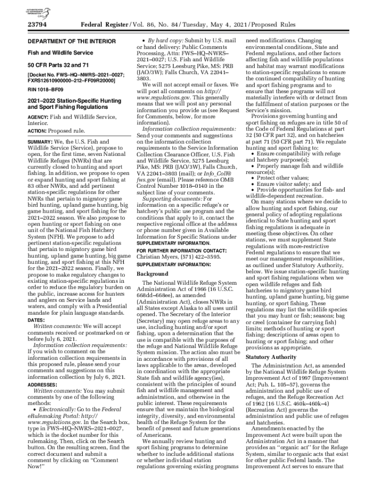 23794Federal Register / Vol. 86, No. 84 / Tuesday, May 4, 2021 / Proposed RulesDEPARTMENT OF THE INTERIOR Fish and Wildlife Service 50 CFR Parts 32 and 71 Docket No. FWSHQNWRS20210027; FXRS12610900000212FF09R20000