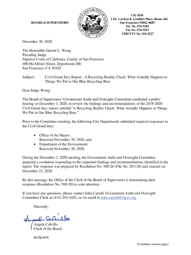 BOARD of SUPERVISORSCity Hall 1 Dr. Carlton B. The Goodliest Place, Room 244 San Francisco 941024689 Tel. No. 5545184 Fax No. 5545163 TDD/TTY No. 5545227December 30, 2020 The Honorable Garrett L.