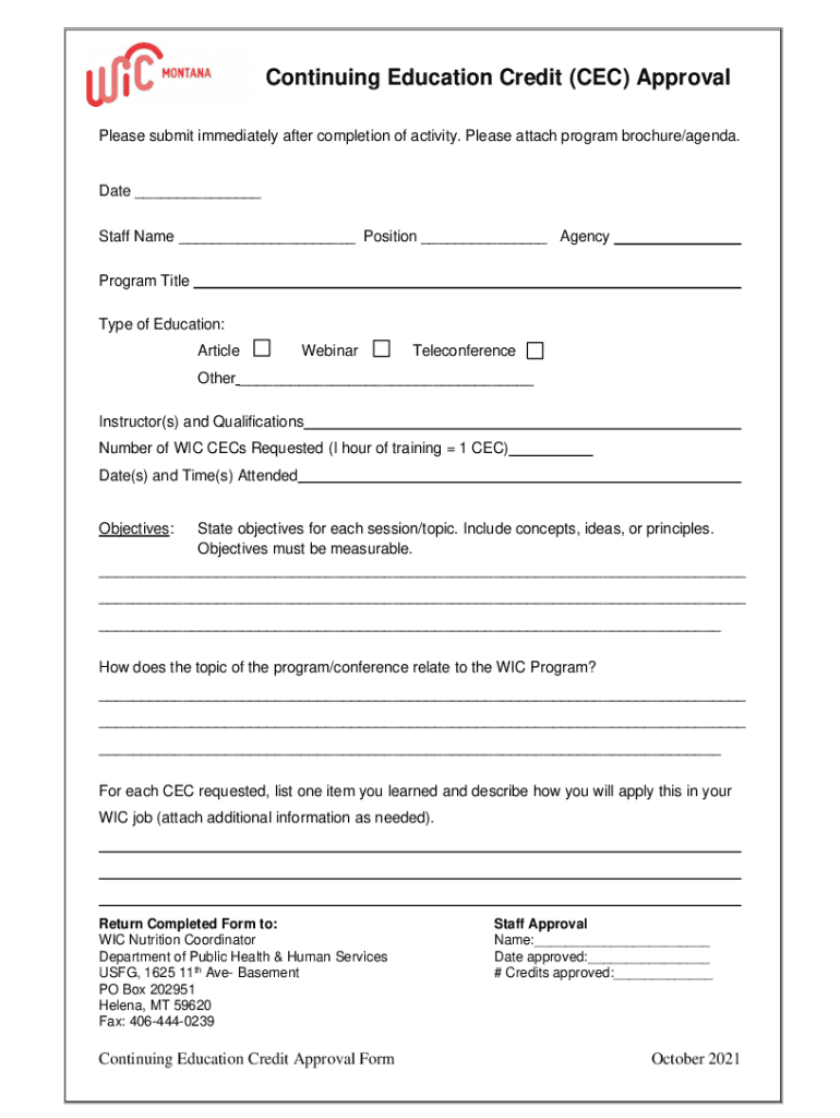 Continuing Education Credit (CEC) Approval Please submit immediately after completion of activity. Please attach program brochure/agenda. Date Staff Name Position Agency Program Title Type of Education: