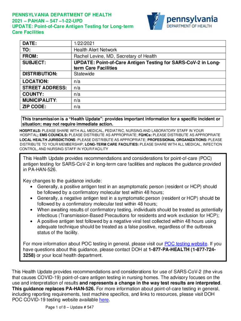 PENNSYLVANIA DEPARTMENT OF HEALTH 2021 PAGAN 547 122UPD UPDATE: Poincare Antigen Testing for Long term Care Facilities DATE: TO: FROM: SUBJECT: DISTRIBUTION:1/22/2021 Health Alert Network Rachel Levine,