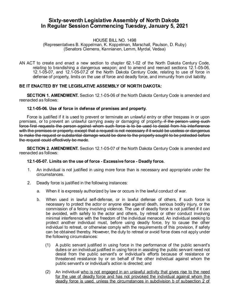 Sixty seventh Legislative Assemblies of North Dakota In Regular Session Commencing Tuesday, January 5, 2021, HOUSE BILL NO. 1498 (Representatives B. Koppel man, K. Koppel man, Marshall, Paulson, D.