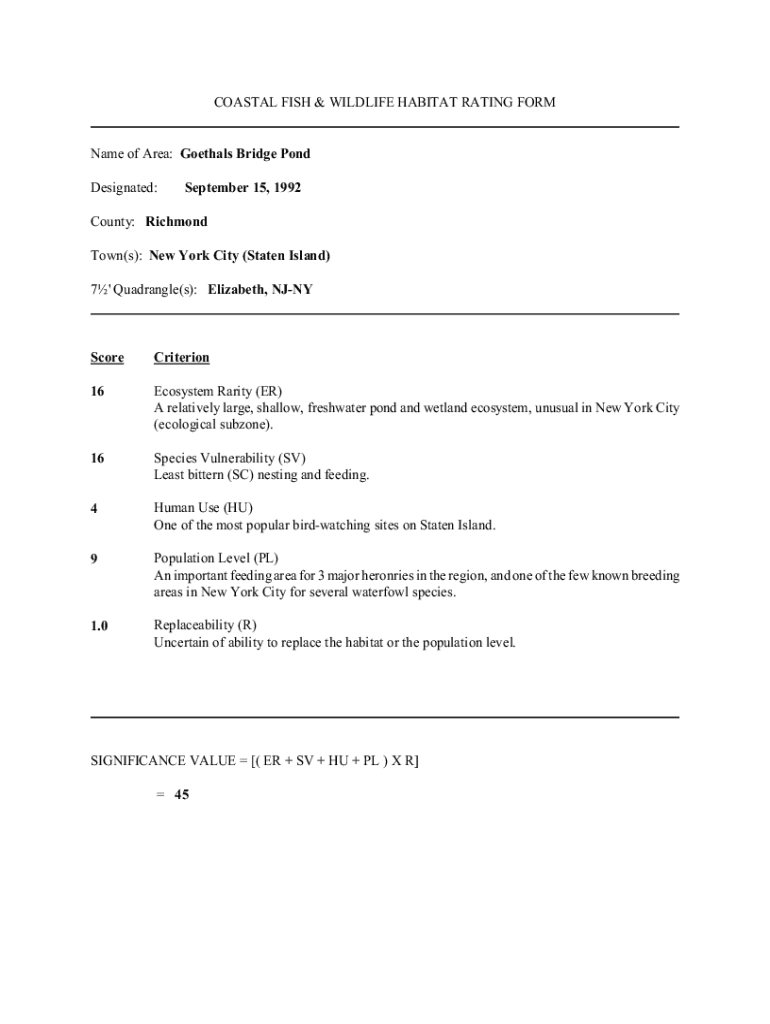 COASTAL FISH & WILDLIFE HABITAT RATING Forename of Area: Goethals Bridge Pond Designated:September 15, 1992County: Richmond Town(s): New York City (Staten Island) 7 Quadrangle(s): Elizabeth, NJNYScoreCriterion16Ecosystem