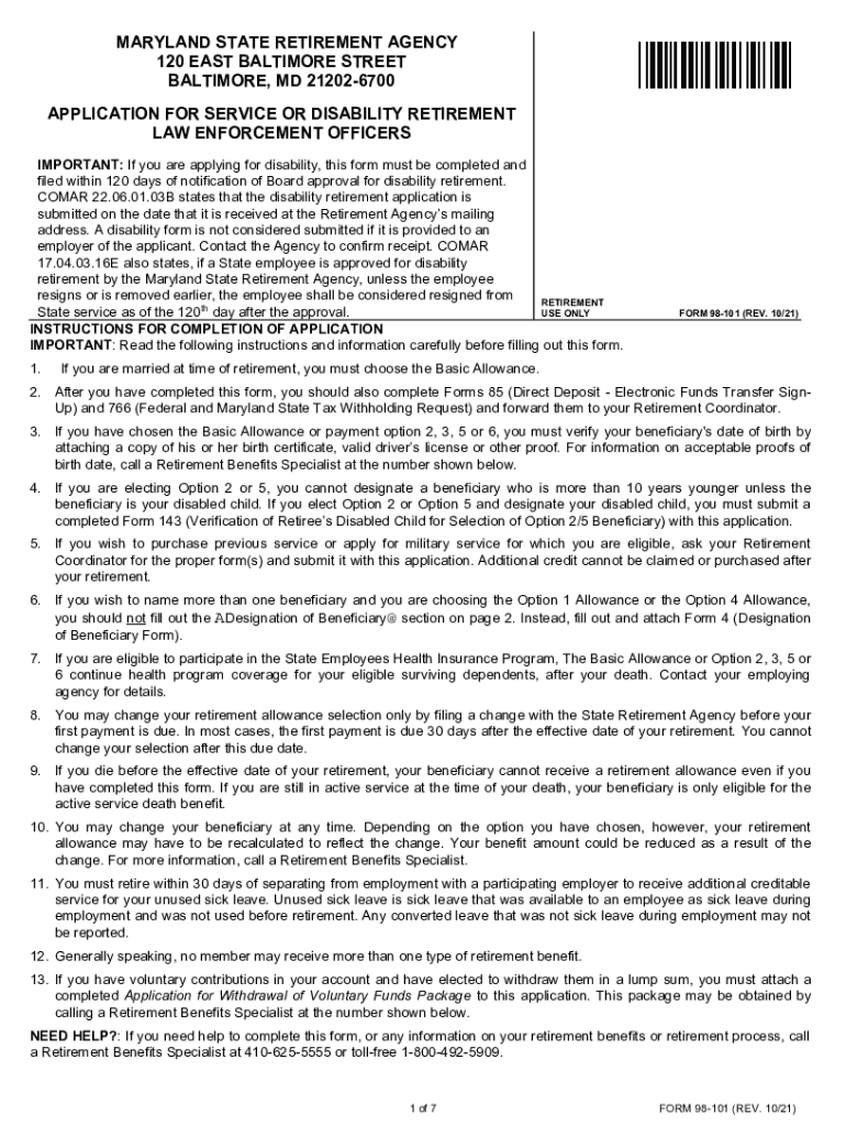 MARYLAND STATE RETIREMENT AGENCY 120 EAST BALTIMORE STREET BALTIMORE, MD 212026700 APPLICATION FOR SERVICE OR DISABILITY RETIREMENT LAW ENFORCEMENT OFFICERS IMPORTANT: If you are applying for disability,