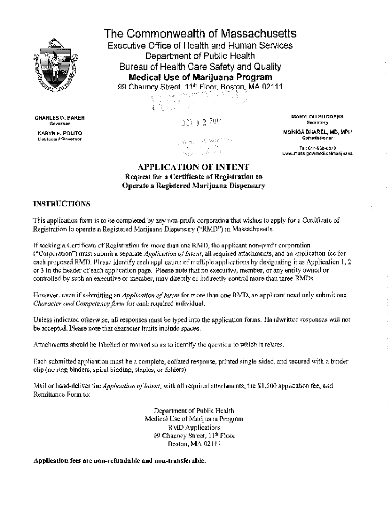 The Commonwealth of Massachusetts Executive Office of Health and Human Services Department of Public Health Bureau of Health Care Safety and Quality Medical Use of Marijuana Program 99 Chauncey Street,