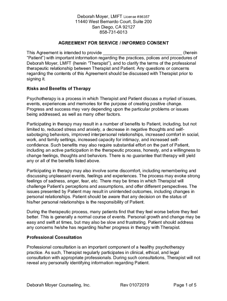 Get the free AGREEMENT FOR SERVICE / INFORMED ... - Deborah Moyer, LMFT