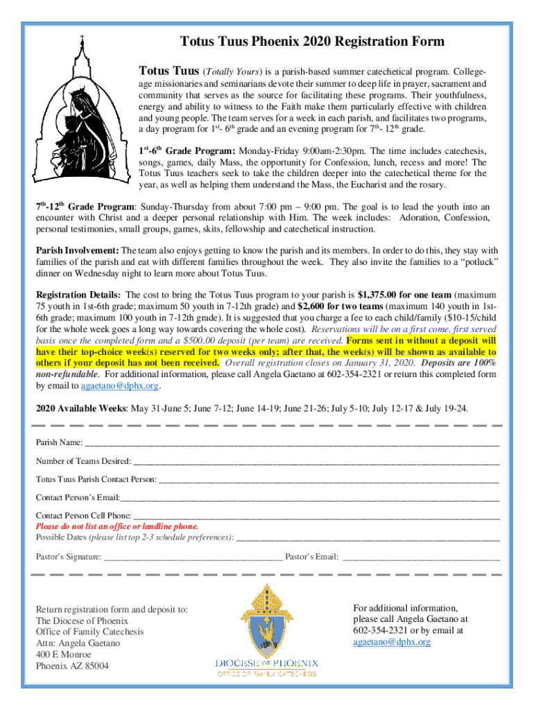 Titus Thus Phoenix 2020 Registration Form Titus Thus(Totally Yours) is a parish based summer catechetical program. College age missionaries and seminarians devote their summer to deep life in prayer,