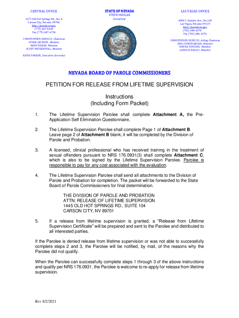 CENTRAL OFFICIATE OF NEVADANS VEGAS OFFICESTEVE SISOLAK Governor1677 Old Hot Springs Rd., Ste. A Carson City, Nevada 89706 http://parole.nv.gov (775) 6875049 Fax (775) 6876736 CHRISTOPHER JERICHO,