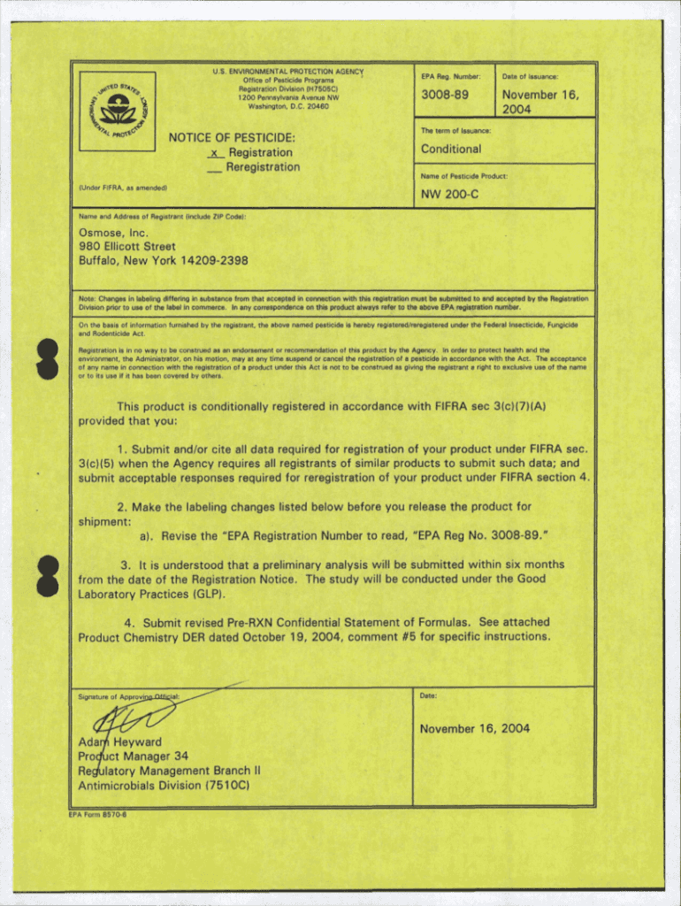 U.S. ENVIRONMENTAL PROTECTION AGENCY Office of Pesticide Programs Registration Division (H75O5C) 1200 Pennsylvania Avenue NW Washington. D.C. 20460NOTICE OF PESTICIDE: X Registration ReregistrationEPA