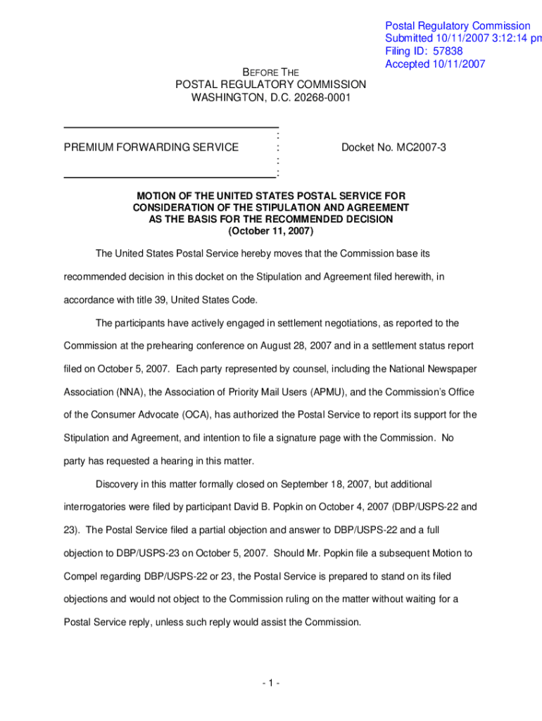 BEFORE THE POSTAL REGULATORY COMMISSION WASHINGTON, D.C. 202680001PREMIUM FORWARDING SERVICE: : : :Postal Regulatory Commission Submitted 10/11/2007 3:12:14 pm Filing ID: 57838 Accepted 10/11/2007Docket