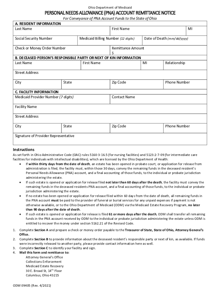 Ohio Department of MedicaidPERSONAL NEEDS ALLOWANCE (PNA) ACCOUNT REMITTANCE NOTICE A. RESIDENT INFORMATION Last Name Conveyance of PNA Account Funds to the State of Ohio First Asocial Security Number