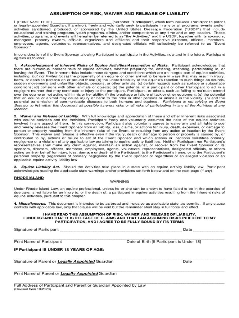 ASSUMPTION OF RISK, WAIVER AND RELEASE OF LIABILITY I PRINT NAME HERE (hereafter, Participant “, which term includes Participants parent or legally appointed Guardian, if a minor), freely and voluntarily