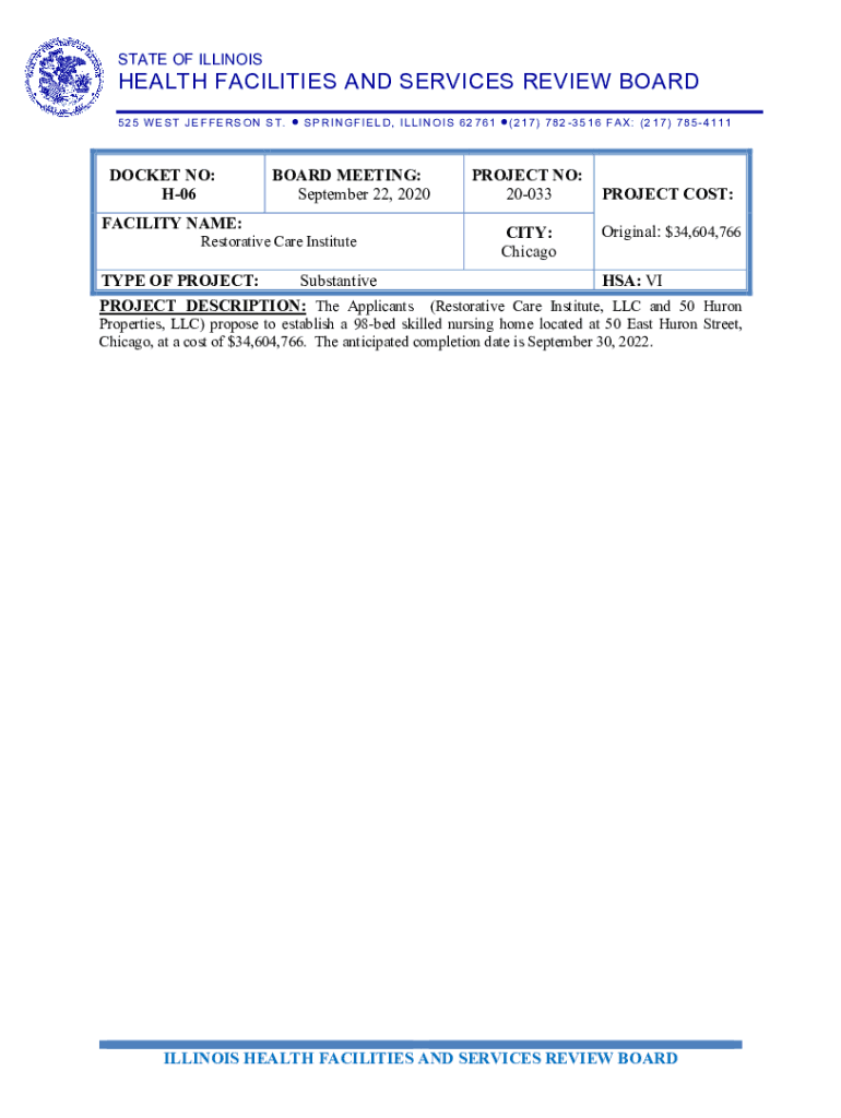 STATE OF ILLINOISHEALTH FACILITIES AND SERVICES REVIEW BOARD 5 2 5 W E S T J E F F E RS O N S T.DOCKET NO: H06S P RI N G F I E L D, I L L I NO I S 6 2 7 6 1BOARD MEETING: September 22, 2020FACILITY
