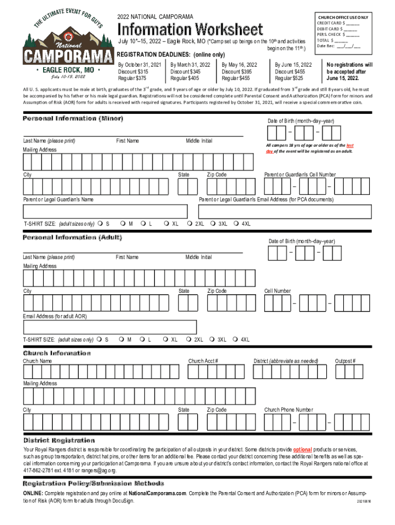 2022 NATIONAL CAMPORAMAInformation Worksheet July 10×15, 2022 Eagle Rock, MO (*Camp set up beings on the 10th and activities begin on the 11th.)REGISTRATION DEADLINES: (online only) By October 31,