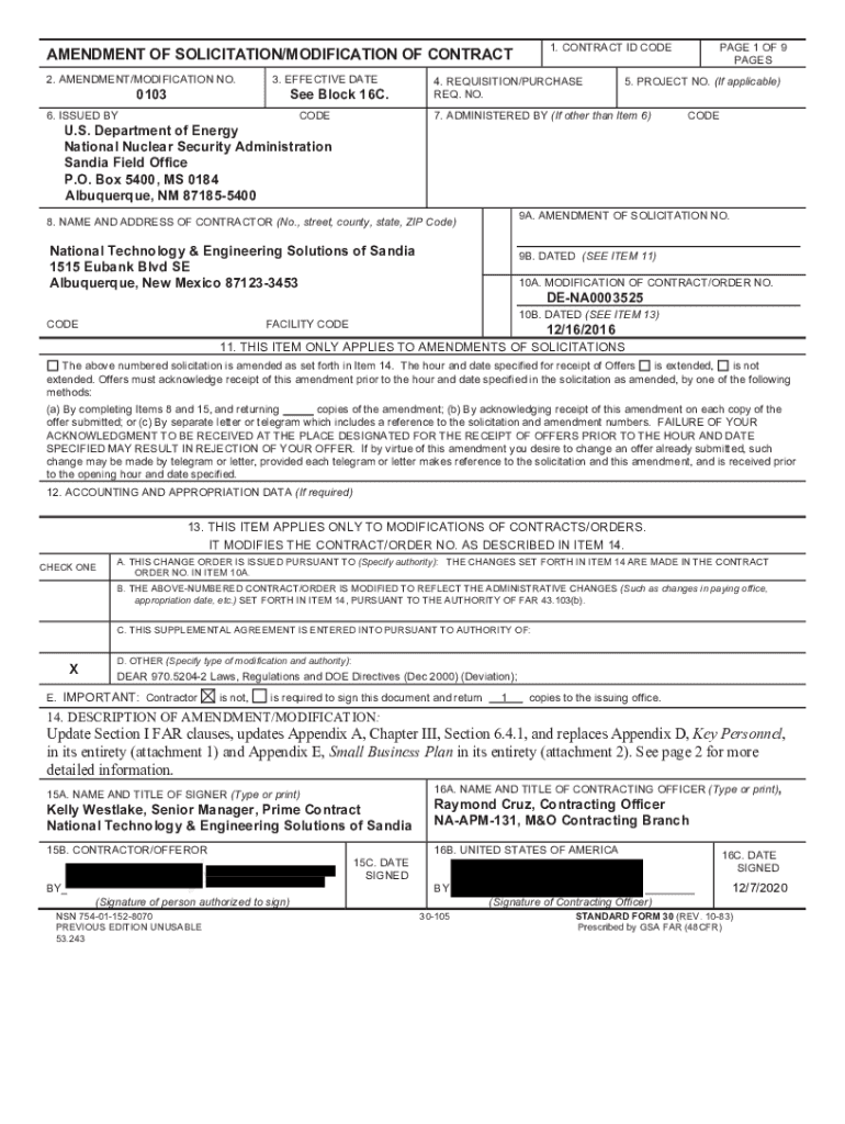 1. CONTRACT ID CODEPENDENT OF SOLICITATION/MODIFICATION OF CONTRACT 2. AMENDMENT/MODIFICATION NO.3. EFFECTIVE DATE0103See Block 16C.6. ISSUED BYCODE4. REQUISITION/PURCHASE REQ. NO.PAGE 1 OF 9 PAGES5.