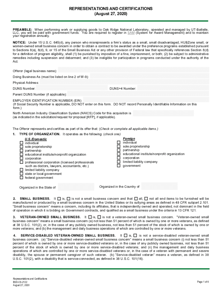 REPRESENTATIONS AND CERTIFICATIONS (August 27, 2020)PREAMBLE: When performing work or supplying goods to Oak Ridge National Laboratory, operated and managed by UTBattelle, LLC, you will be paid with