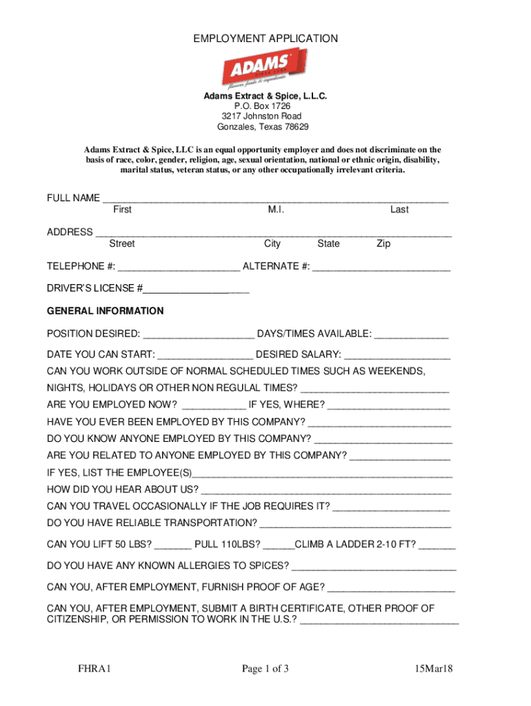 EMPLOYMENT APPLICATION Adams Extract & Spice, L.L.C. P.O. Box 1726 3217 Johnston Road Gonzales, Texas 78629 Adams Extract & Spice, LLC is an equal opportunity employer and does not discriminate on