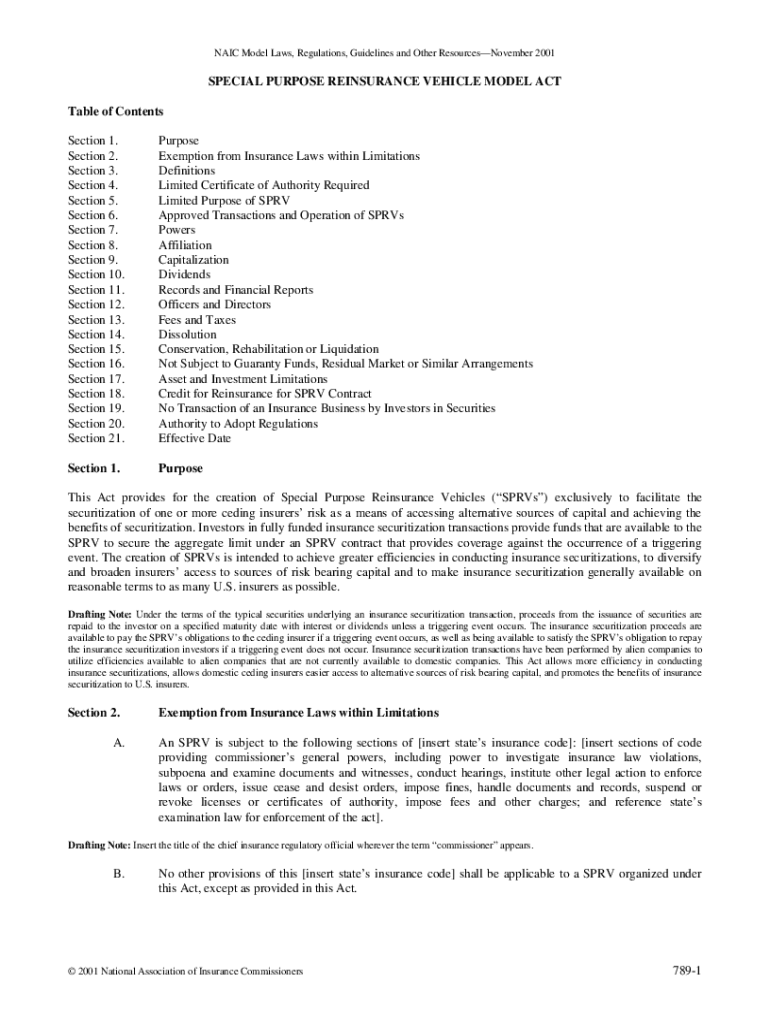 NAIL Model Laws, Regulations, Guidelines and Other Resources November 2001SPECIAL PURPOSE REINSURANCE VEHICLE MODEL ACT Table of Contents Section 1. Section 2. Section 3. Section 4. Section 5. Section