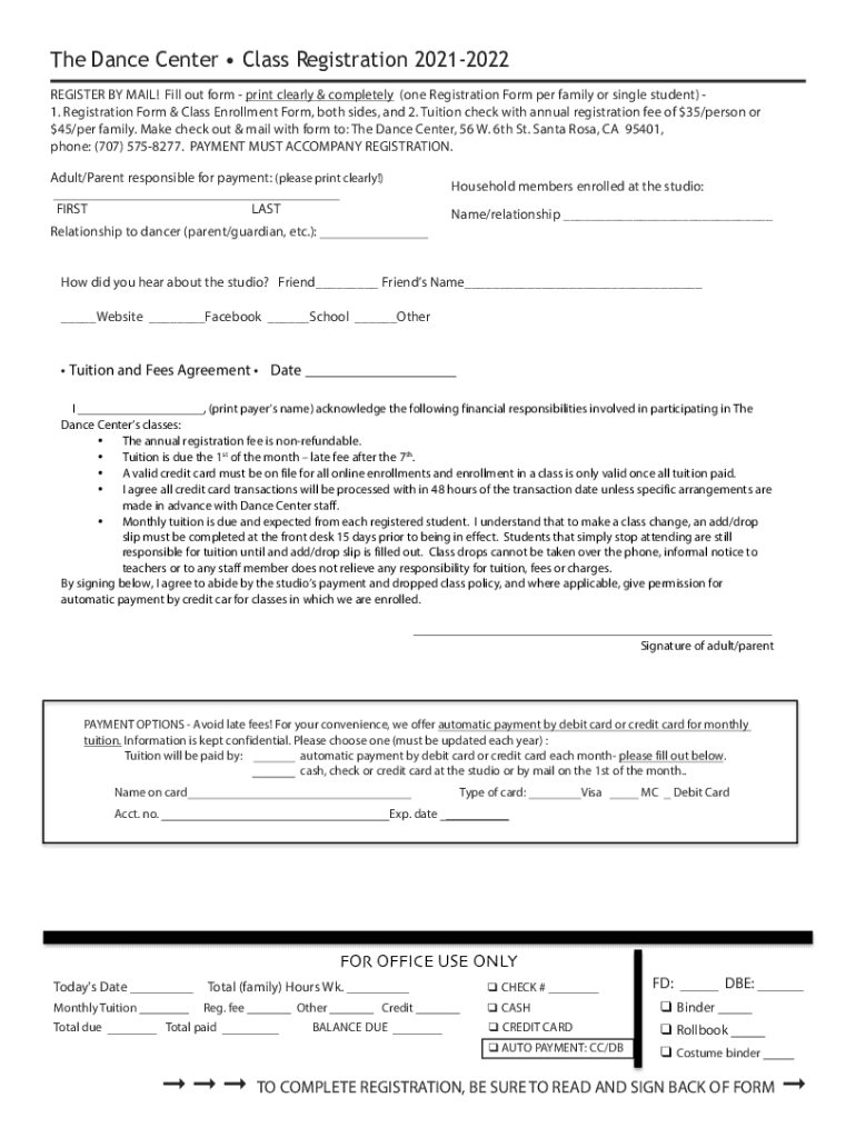 The Dance Center Class Registration 20212022 REGISTER BY MAIL! Fill out form print clearly & completely (one Registration Form per family or single student) 1. Registration Form & Class Enrollment