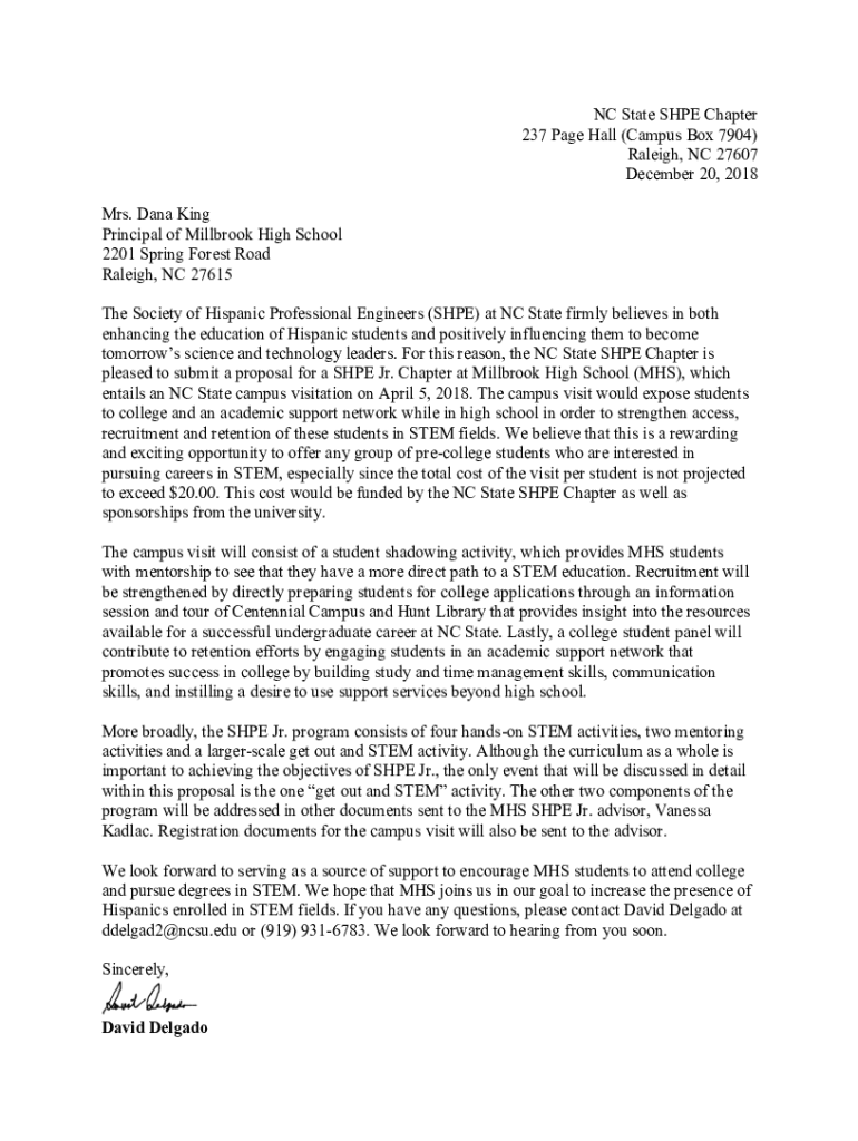 NC State SHE Chapters 237-Page Hall (Campus Box 7904) Raleigh, NC 27607 December 20, 2018, Mrs. Dana King Principal of Mill brook High School 2201 Spring Forest Road Raleigh, NC 27615 The Society