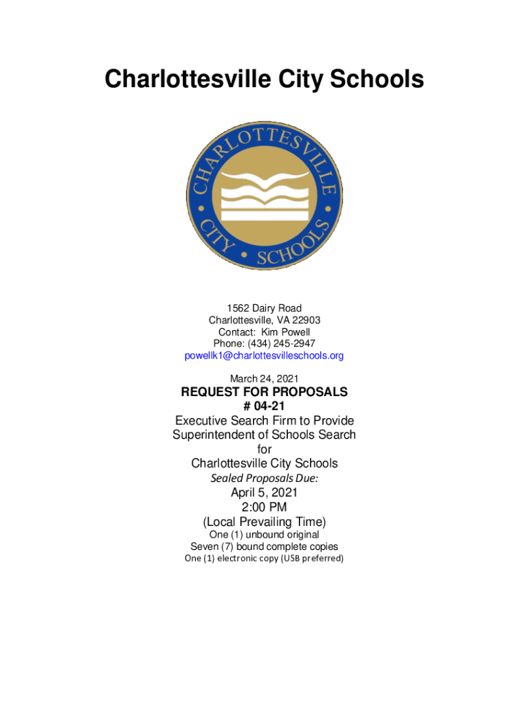 Charlottesville City Schools1562 Dairy Road Charlottesville, VA 22903 Contact: Kim Powell Phone: (434) 2452947 powellk1@charlottesvilleschools.org March 24, 2021REQUEST FOR PROPOSALS # 0421 Executive