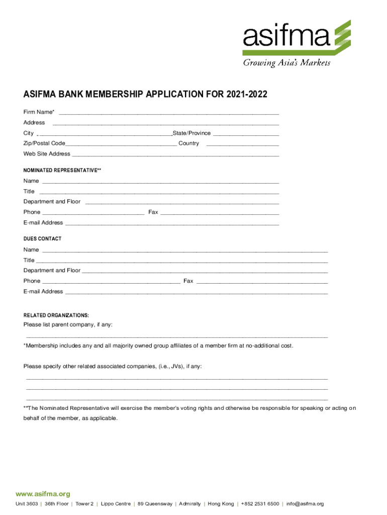AS IFMA BANK MEMBERSHIP APPLICATION FOR 20212022 Firm Name* Address City State/Province Zip/Postal Code Country Website Address NOMINATED REPRESENTATIVE** Name Title Department and Floor Phone Fax