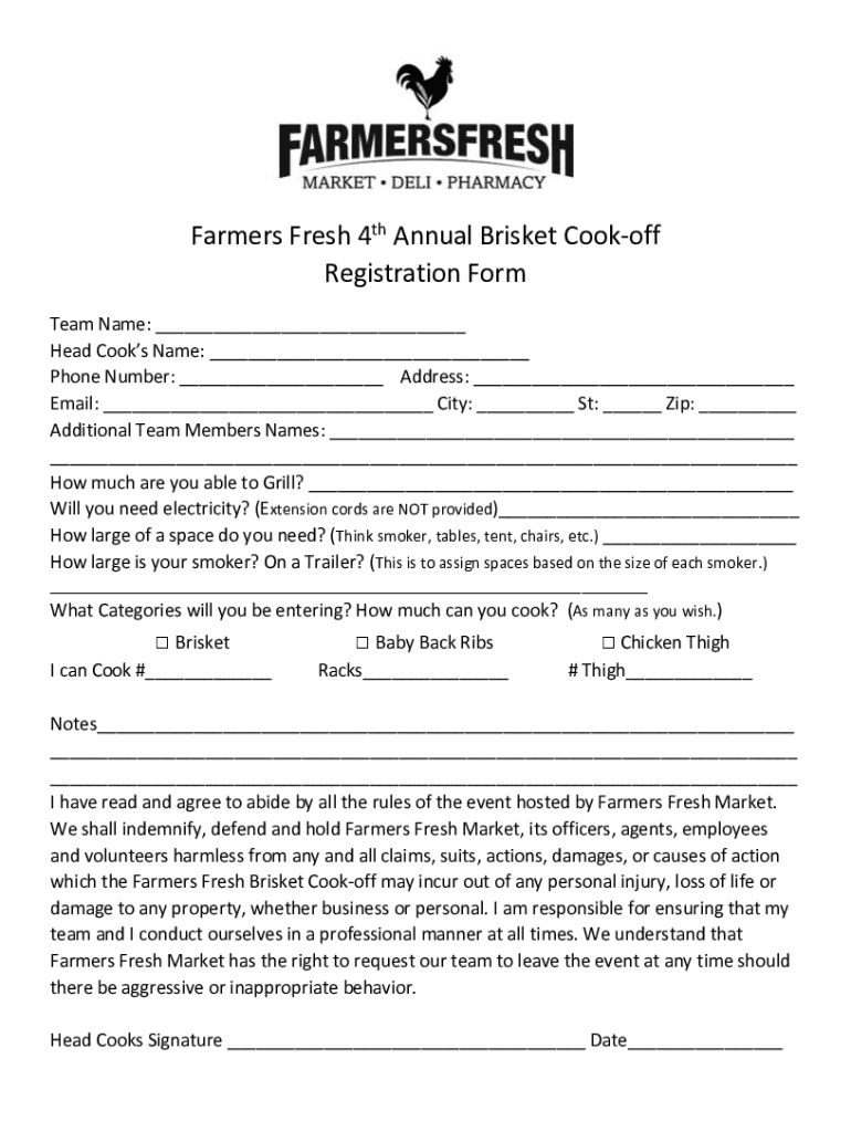 Farmers Fresh 4th Annual Brisket Cook off Registration Form Team Name: Head Cooks Name: Phone Number: Address: Email: City: St: Zip: Additional Team Members Names: How much are you able to Grill?
