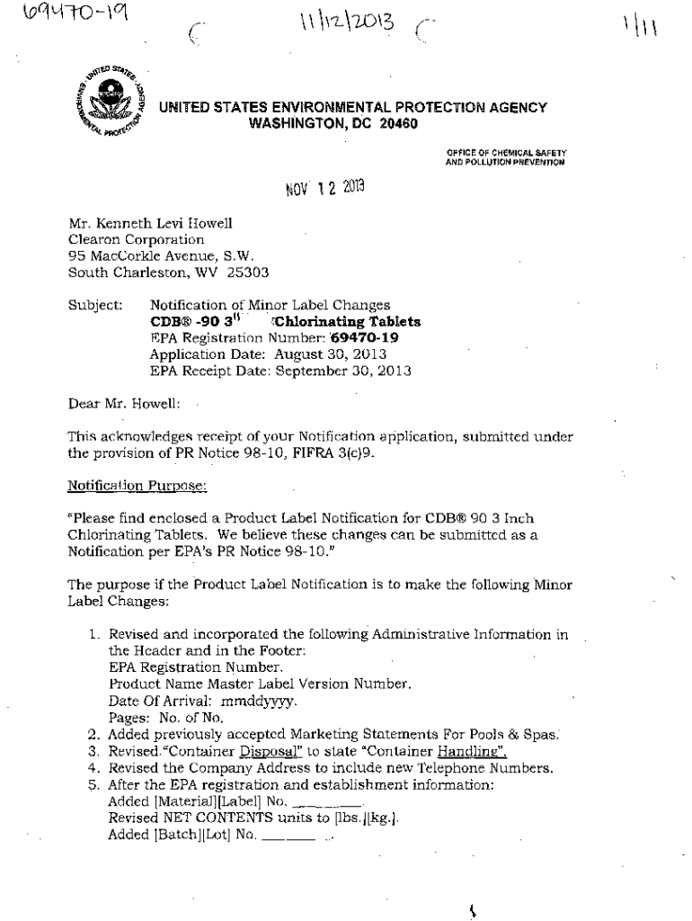UNITED STATES ENVIRONMENTAL PROTECTION AGENCY WASHINGTON, DC 20460 OFFICE OF CHEMICAL SAFETY AND POLLUTION PREVENTION 1 2 2013 Mr. Kenneth Levi Howell Clarion Corporation 95 Markle Avenue, S.W. South