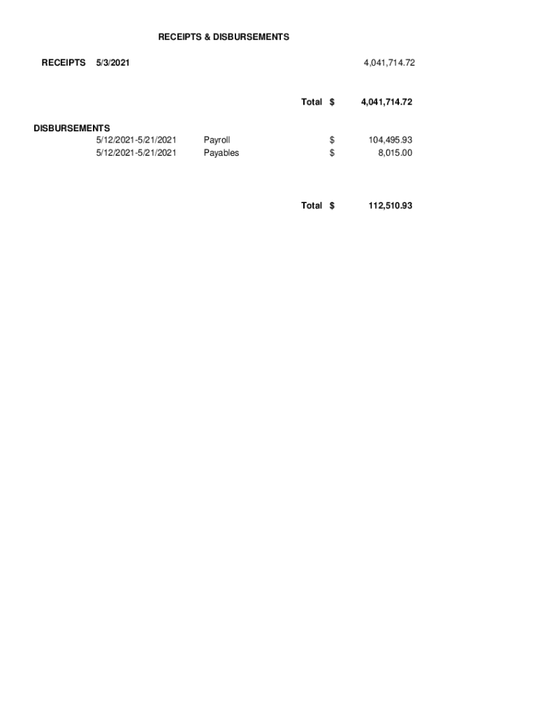RECEIPTS & DISBURSEMENTS RECEIPTS5/3/2021DISBURSEMENTS 5/12/20215/21/2021 5/12/20215/21/20214,041,714.72Payroll PayablesTotal $$$4,041,714.72104,495.93 8,015.00Total $112,510.9305/19/2021 12:53 PM