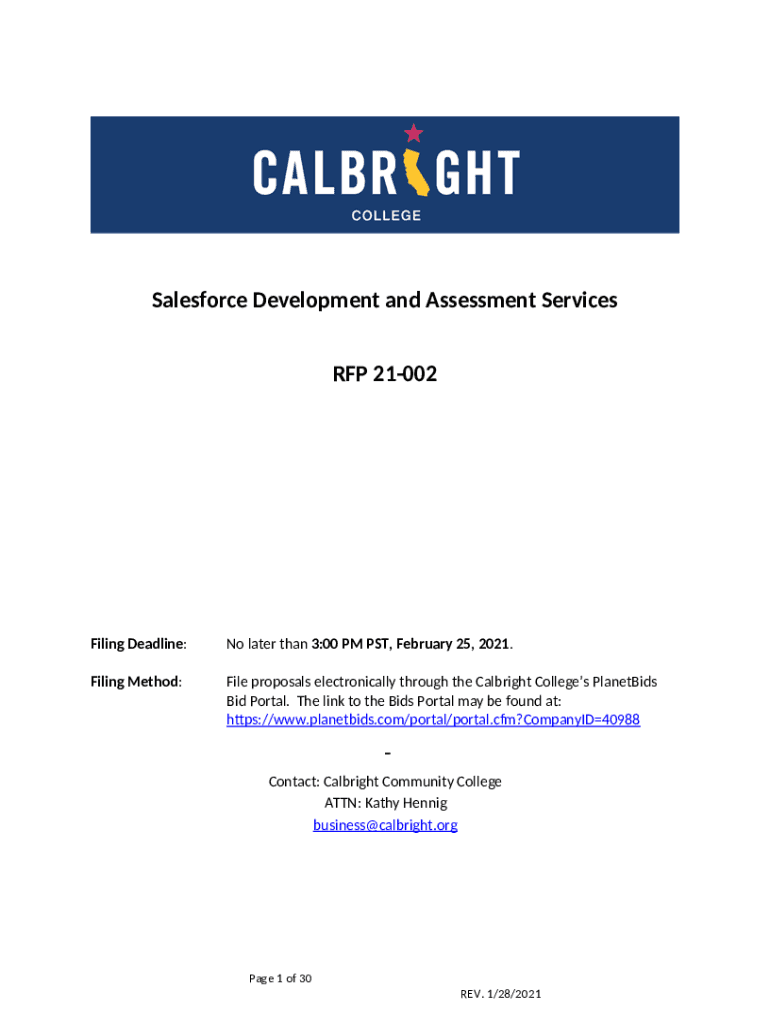 Salesforce Development and Assessment Services RFP 21002Filing Deadline:No later than 3:00 PM PST, February 25, 2021. Filing Method:File proposals electronically through the Cal bright Colleges Planets