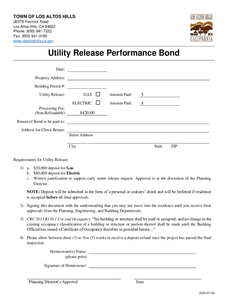 TOWN OF LOS ALTOS HILLS 26379 Fremont Road Los Altos Hills, CA 94022 Phone: (650) 9417222 Fax: (650) 9413160 www.losaltoshills.ca.govUtility Release Performance Bond Date: Property Address: Building