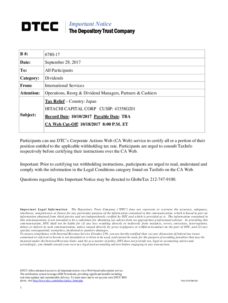 Important Notice The Depository Trust Company #:678017Date:September 29, 2017To:All ParticipantsCategory:DividendsFrom:International ServicesAttention:Operations, Reorg & Dividend Managers, Partners