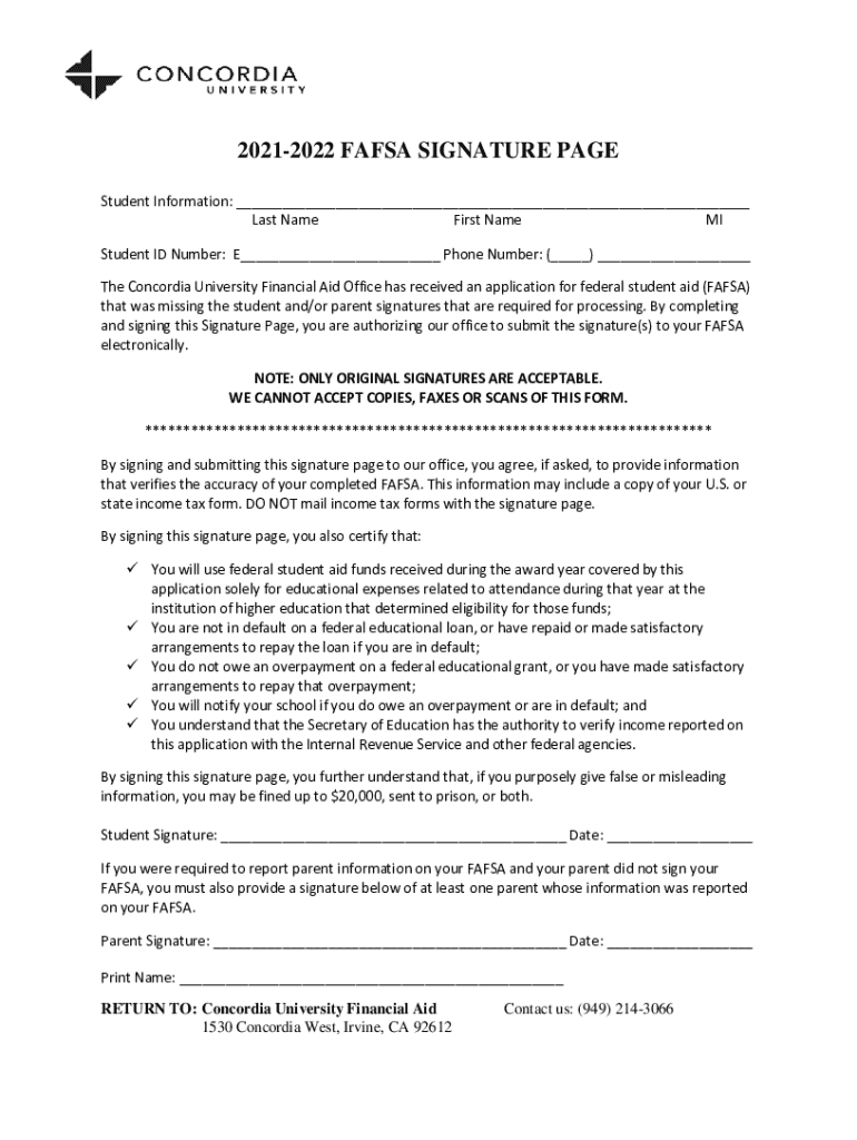 20212022 FAFSA SIGNATURE PAGE Student Information: Last Name First Name MI Student ID Number: E Phone Number: () The Concordia University Financial Aid Office has received an application for federal